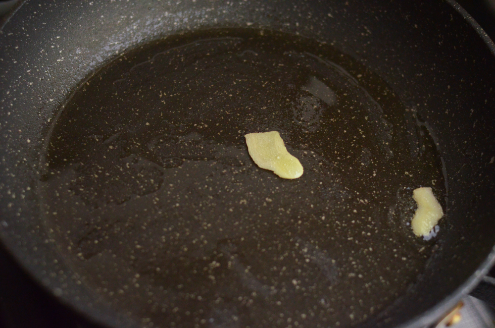 - Heat up a frying pan with oil and sauté sliced ginger for 30seconds.