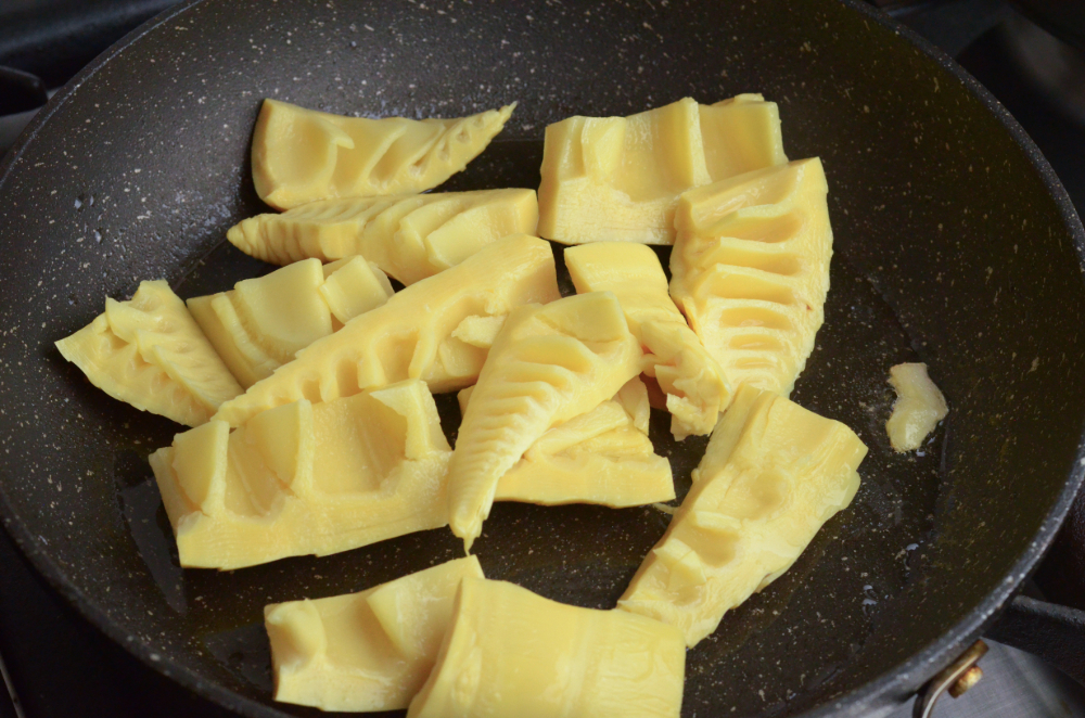 - Add in bamboo shoots and let it sear for 2-3 minutes over medium heat.