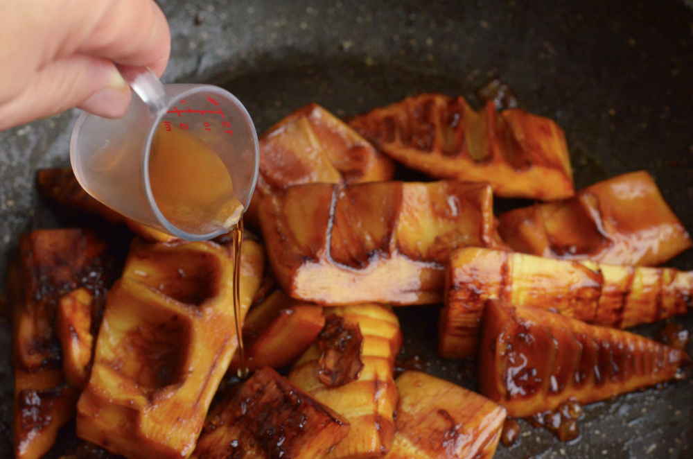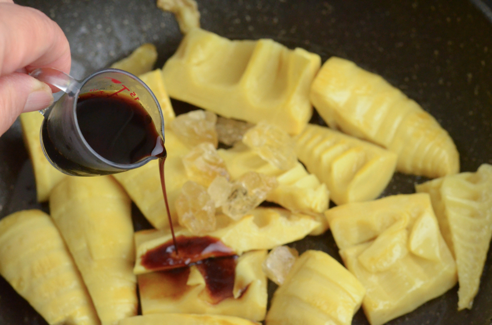 - Once bamboo shoots turned slightly brown, add in light soy sauce, dark soy sauce and rock sugar. Stir to coat.