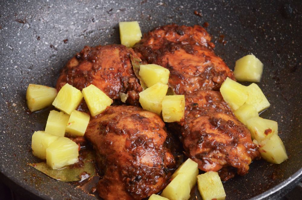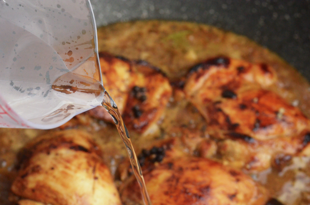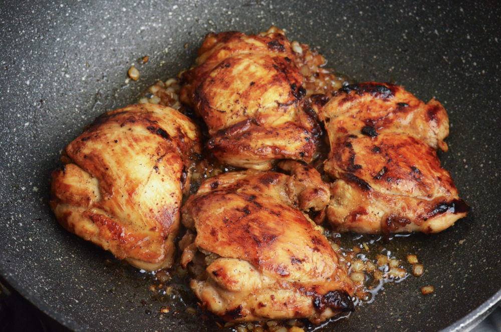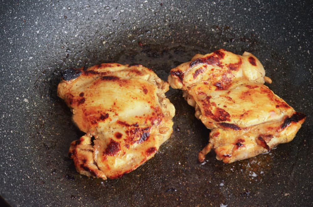 - Heat up the frying pan or wok with 1-2 tbsp of oil. Drain chicken thighs and remove as much liquid as possible. Sear for 3-4 minutes on each side until both sides are well charred.