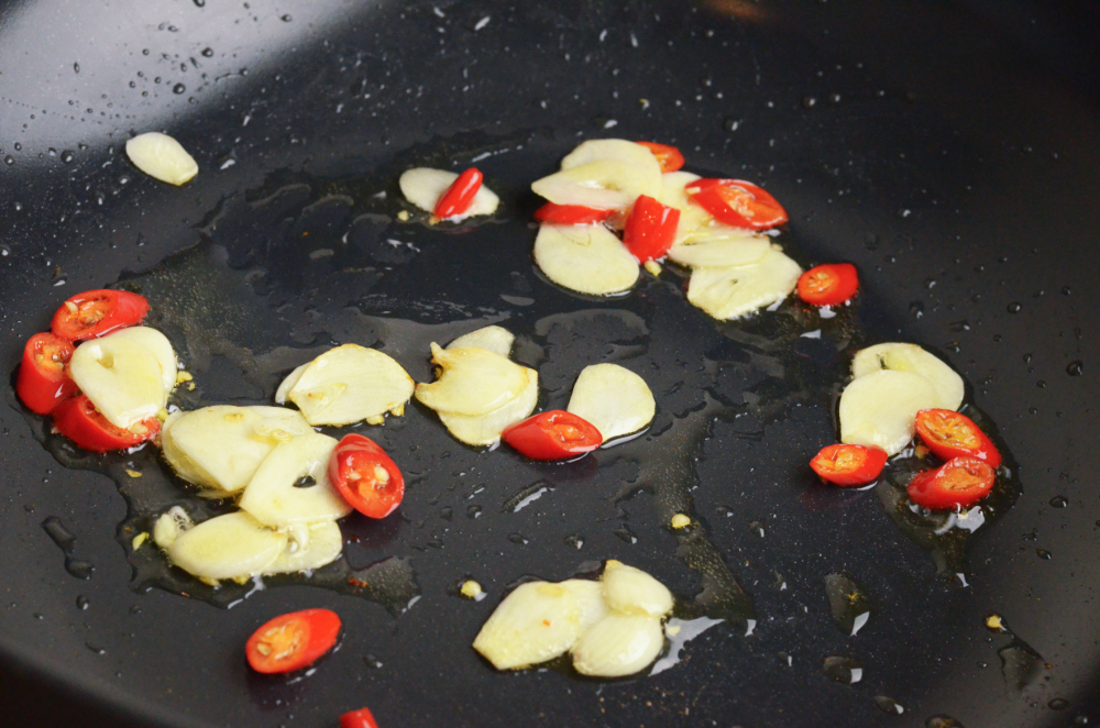 - Heat up a wok over medium heat with 2 tbsp of oil, sauté garlic and chillies for 45 seconds.