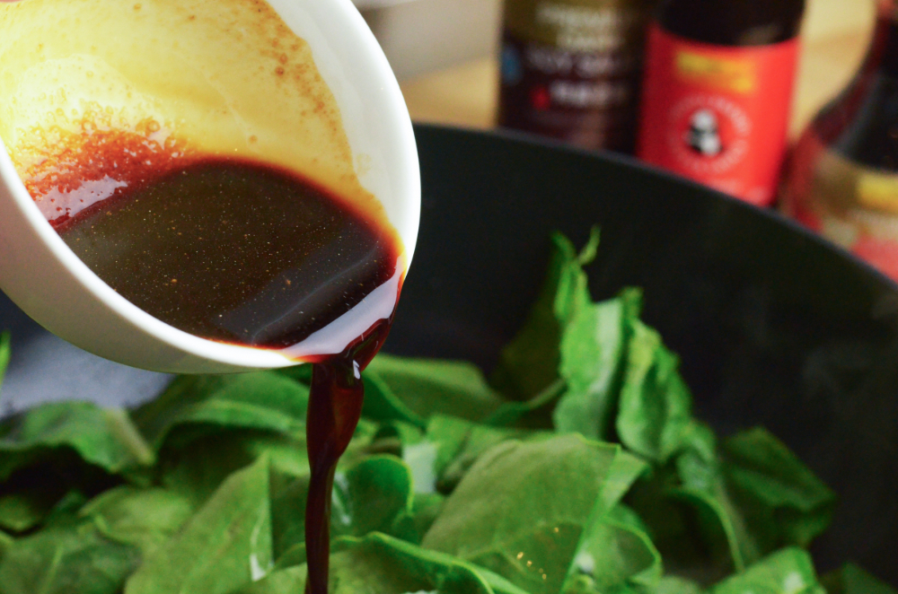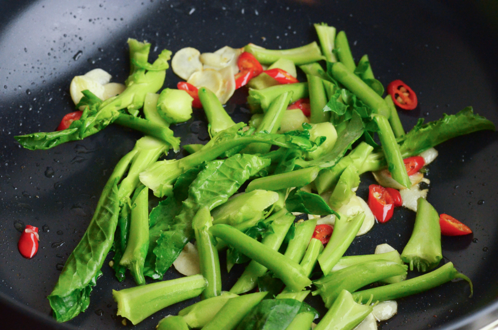 - Add the stem pieces of Chinese broccoli first and stir-fry for a minute. Then add the leafy parts and continue cooking for 30 seconds.