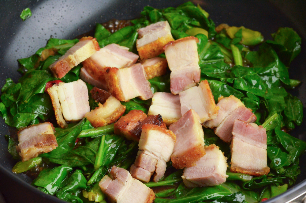 - Add sliced crispy pork belly, stir until well combined and heated through.