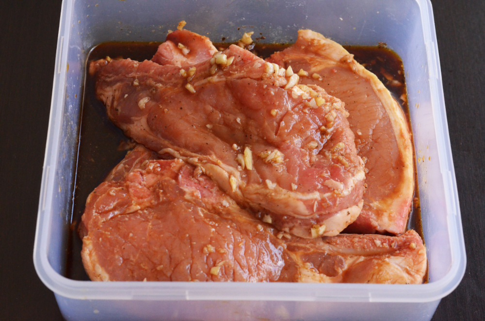 - Marinate the pork chops with calamansi juice, light soy sauce, minced garlic, and black pepper for 15–20 minutes. Use a glass or plastic container, as the acidity of the calamansi may react with metal.