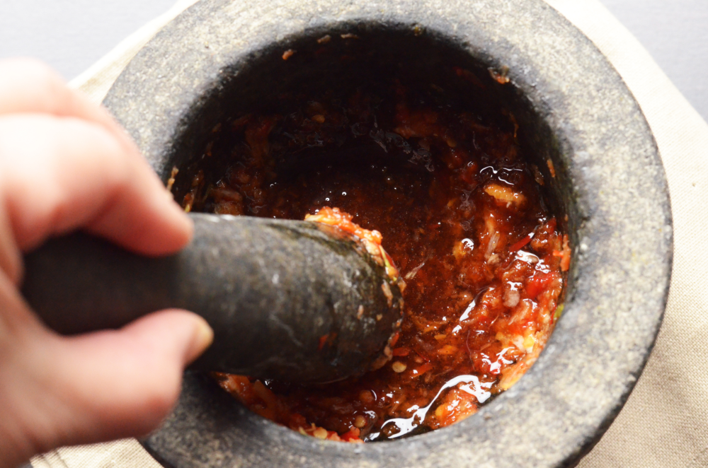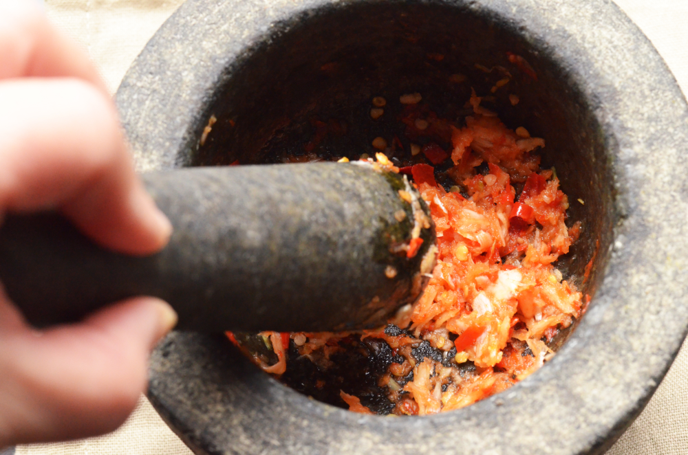 - Pound bird eye chillies and garlic together until you get a smooth paste.