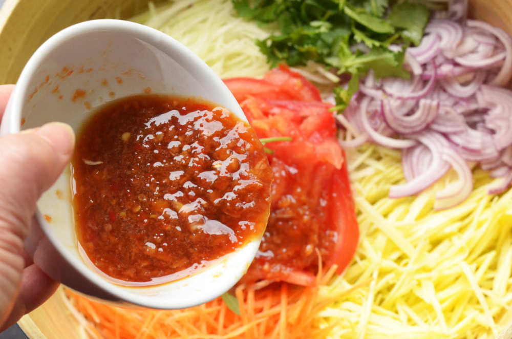 - Place all the shredded ingredients and sliced shallots into a large mixing bowl. Pour the sauce over and mix them up.