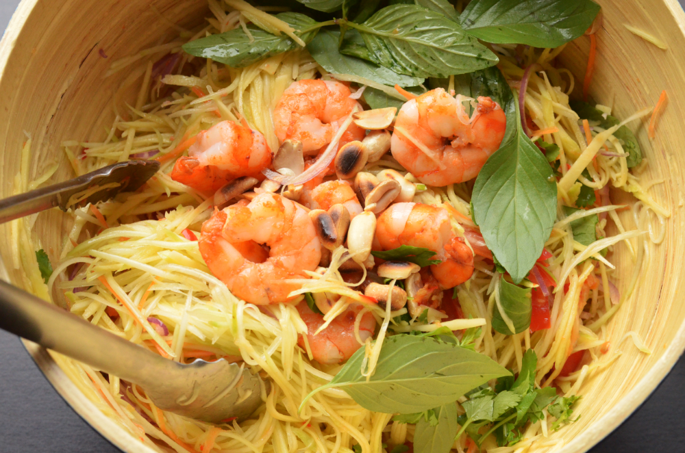 - Add in the Thai basil, cilantro, half of toasted peanuts and prawns. Mix again.