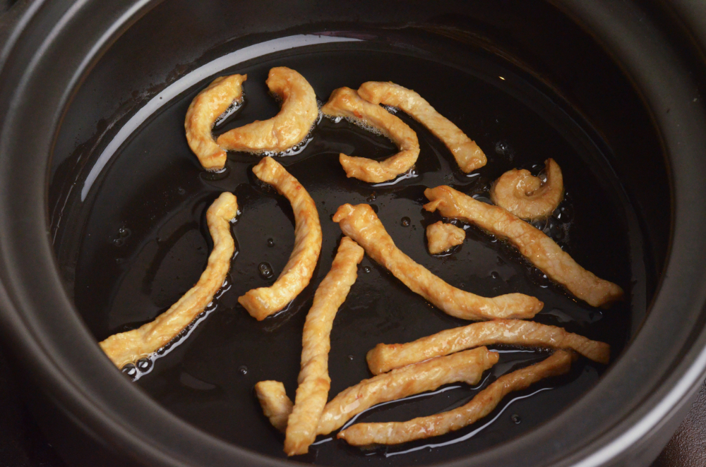 - Heat 2-3 tbsp cooking oil in a wok or pot over medium-high heat. Stir-fry pork in batches until they are golden brown. Remove and set aside.