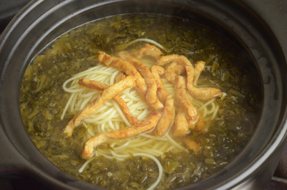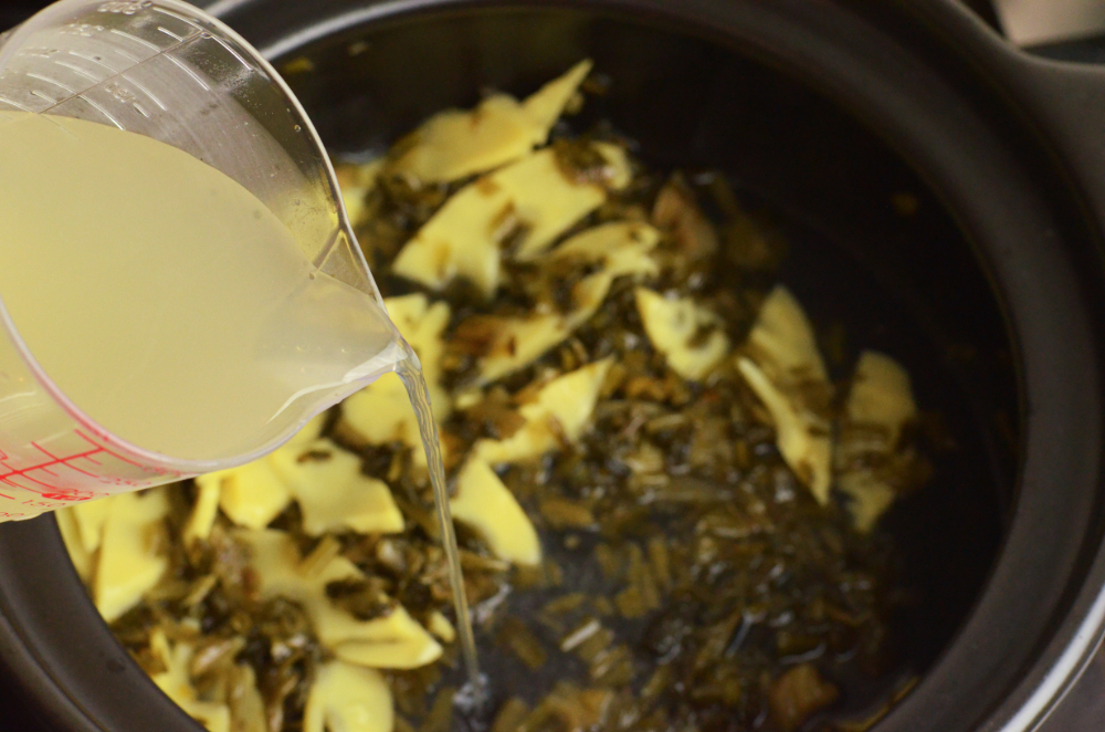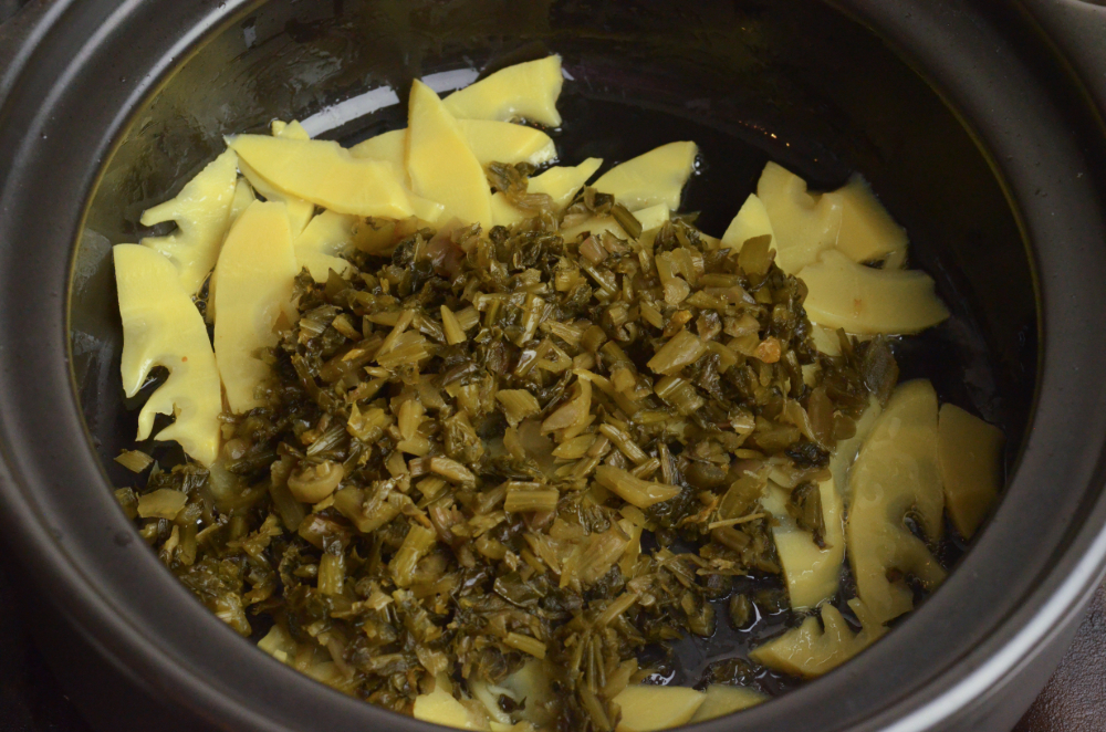 - In the same pot, add bamboo shoots and stir-fry for 1 minute. Add in pickled mustard greens and cook for 30 seconds.