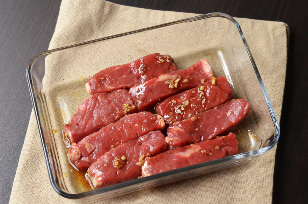 - Slice steak into 6cm strips and marinate with the beef marinade for 20 minutes.