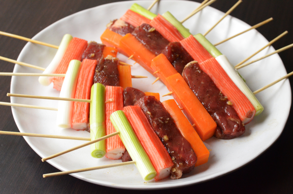- Thread spring onion, crab stick, beef strip, and carrot stick onto skewers in order. Set aside.