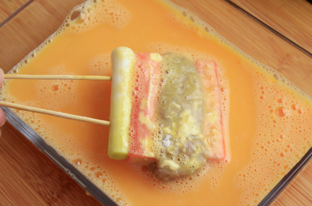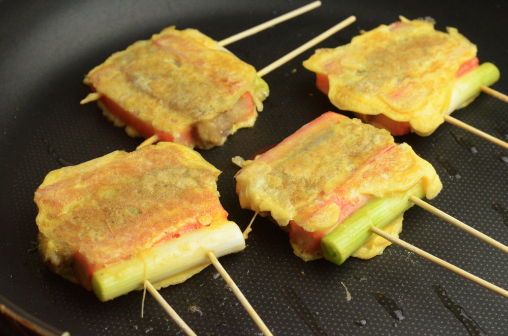 - Heat up a frying pan with 1 tbsp oil. Pan-fry the skewers until golden. If some parts are not fully coated, use a spoon to fill in gaps with the egg mixture.