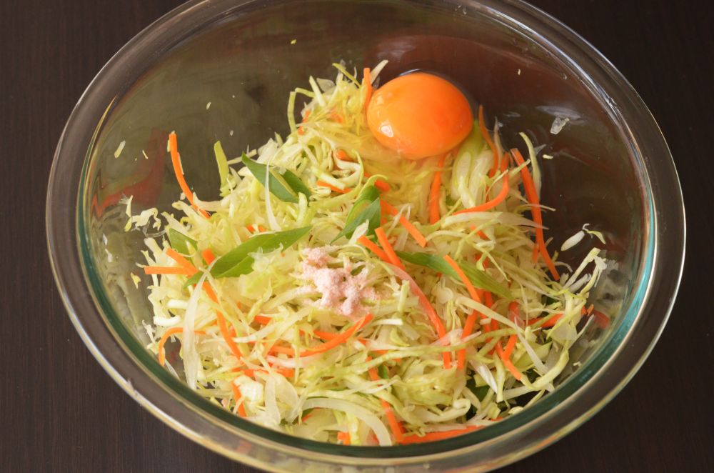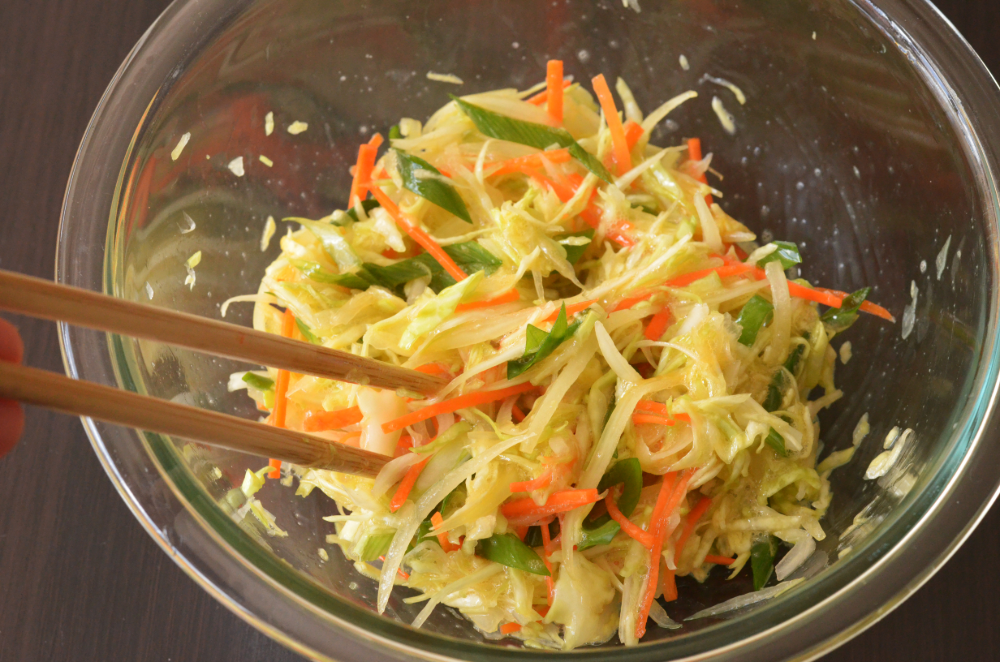 - Place cabbage, carrot and onion in a mixing bowl. Massage the vegetables for 5 seconds.