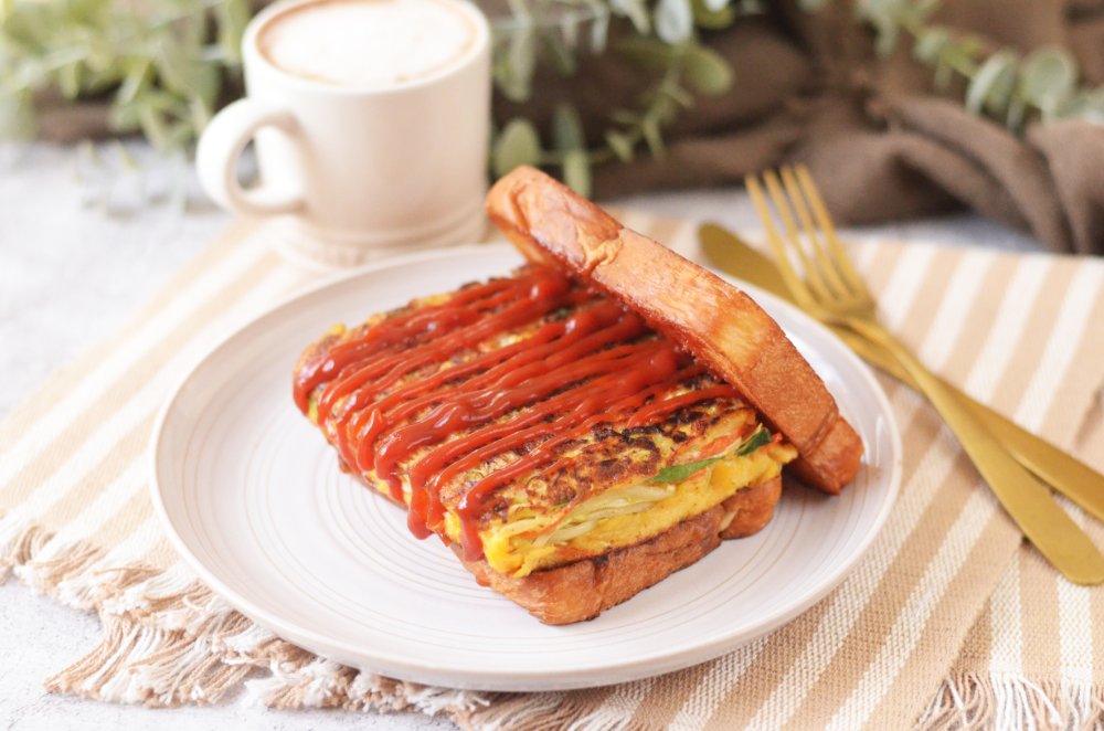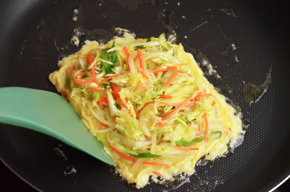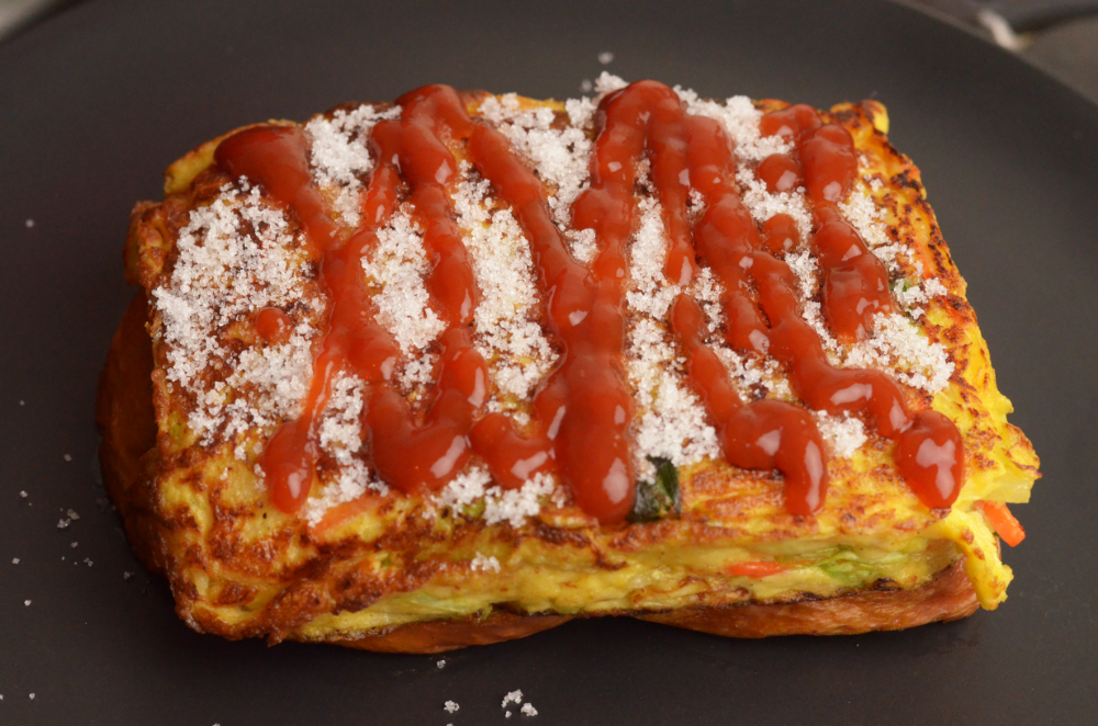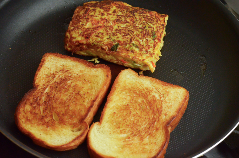 - Heat a large frying pan with some butter. Pour the vegetable mixture in and cook using a spatula to shape it into the size of the bread slices. Cook each side for 3-4 minutes over low heat until brown.