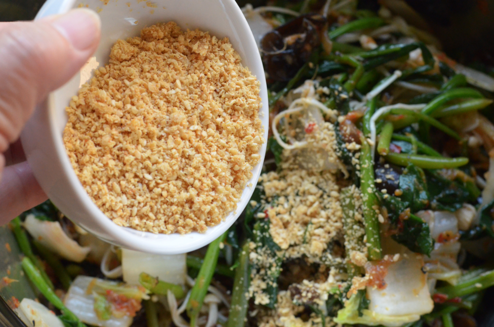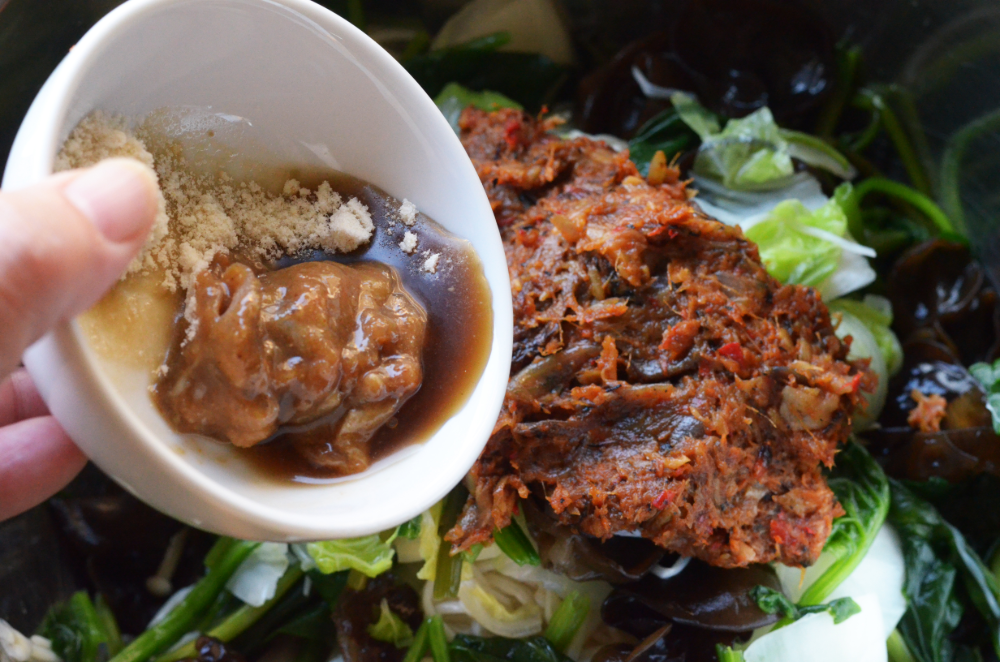 - Place all vegetables in a large bowl, add in the aromatics paste, fish sauce, padaek and chicken bullion. Mix them well until everything is evenly coated.