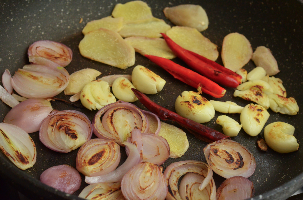 - In the same pan, toast sliced ginger, shallots, garlic cloves and chillies over high heat until slightly charred about 15 mins. Remove the chillies.