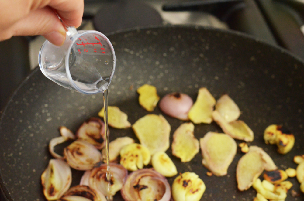- Add water and cover to let it steam the charred aromatics to soften. Remove and set aside to cool.