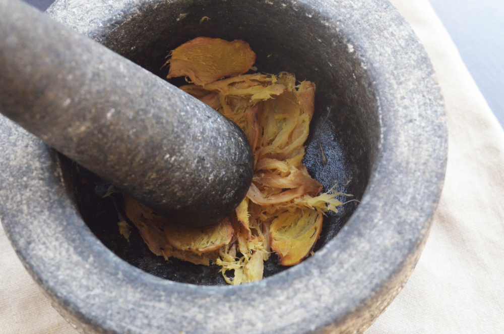 - Pound charred ginger with a mortar into a rough paste.