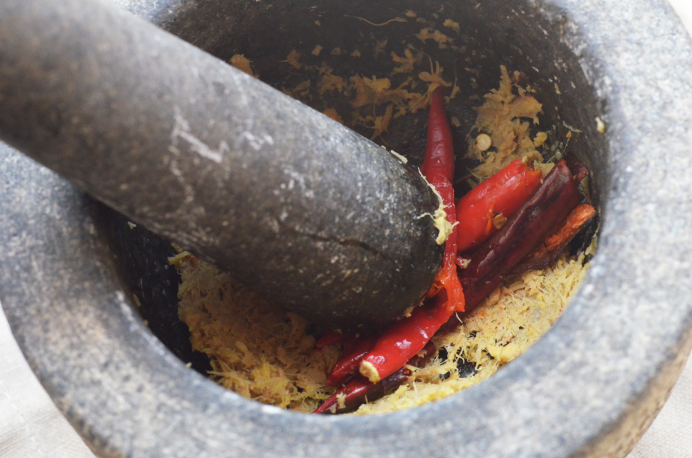 - Add in the chillies and finally the shallots and garlic into a smooth paste.