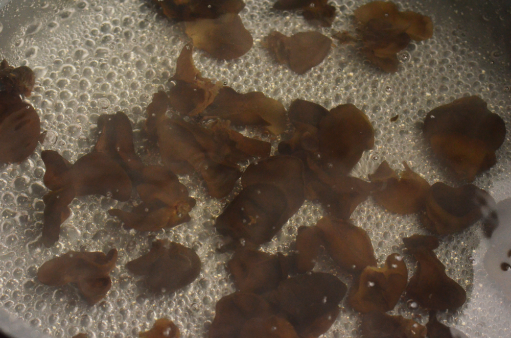 - Bring a large pot of water to boil and blanch the wood ear mushrooms for 3 mins.