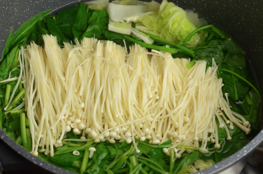 - Wash vegetables and cut into 6cm lengths. Halve the napa cabbage stems if too thick. Trim away the ends of enoki mushrooms. Halves the wood ear mushrooms.