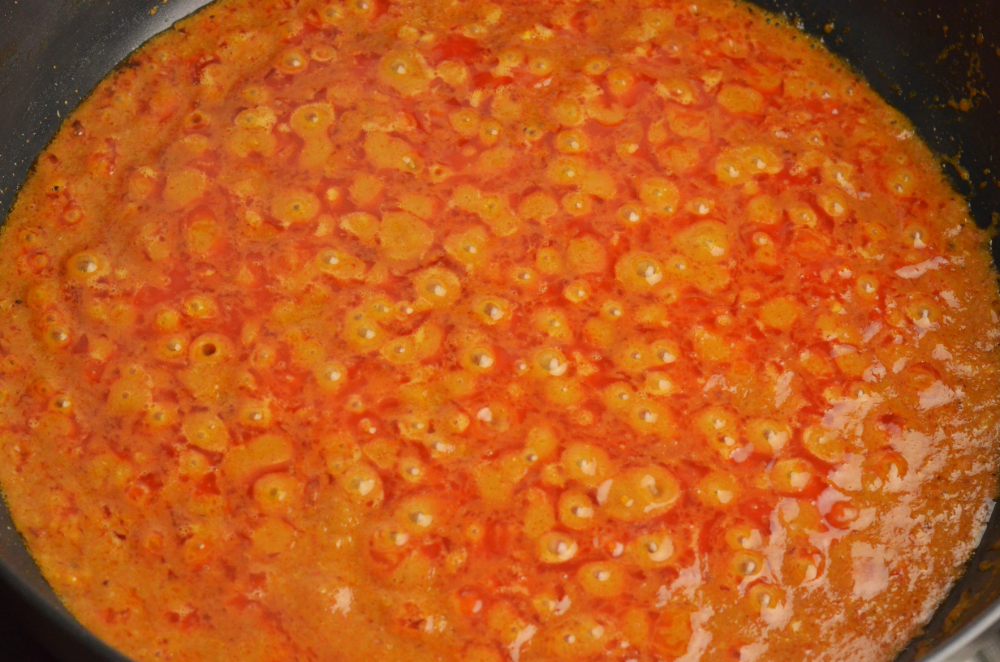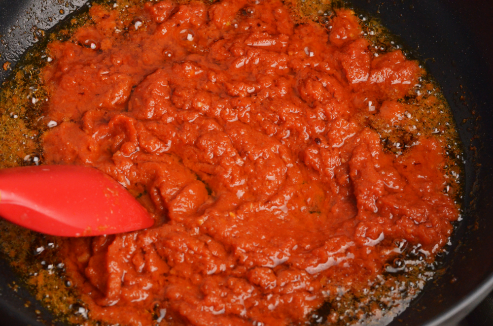 - Heat up the wok with 120ml oil. Once smoke starts to appear, pour in the blended chilli paste and cook until the oil breaks.
