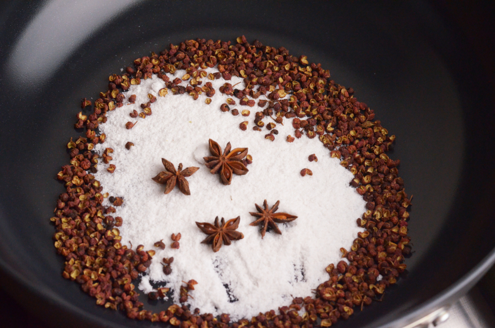 - In a pan over medium heat, toast the Sichuan peppercorns, sea salt, and star anise for 5–6 minutes, or until fragrant and the salt turns slightly brown. Remove from heat and let cool.