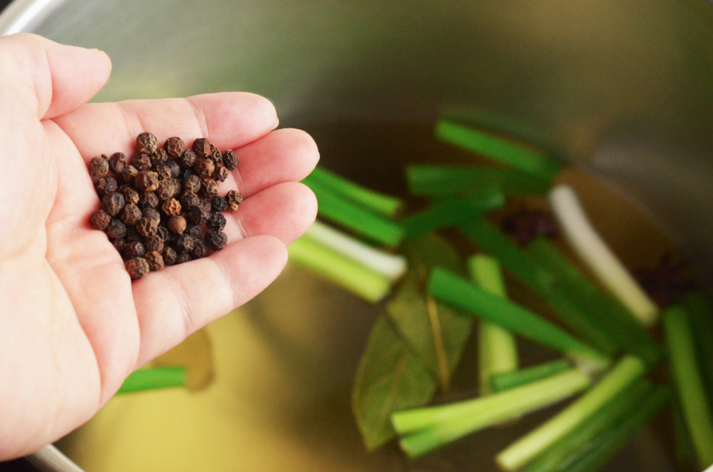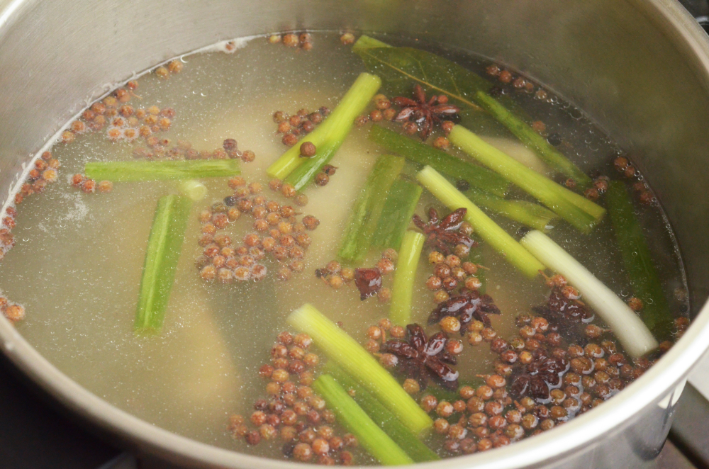 - In a large stockpot, combine all broth ingredients and bring to a gentle boil.