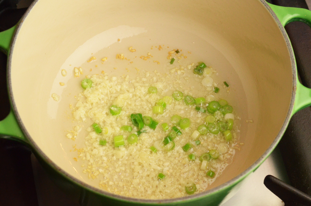 - In a medium heavy bottom pot, heat up cooking oil and sauté minced garlic and white parts of spring onions for 45 seconds.