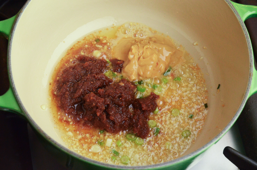 - Add in the sha cha sauce and peanut butter and fry for a minute over low heat.
