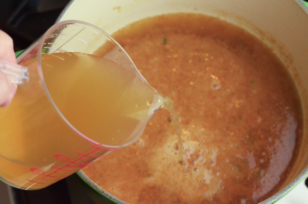 - Pour in chicken stock and let it come to a boil. Simmer for 10 minutes.