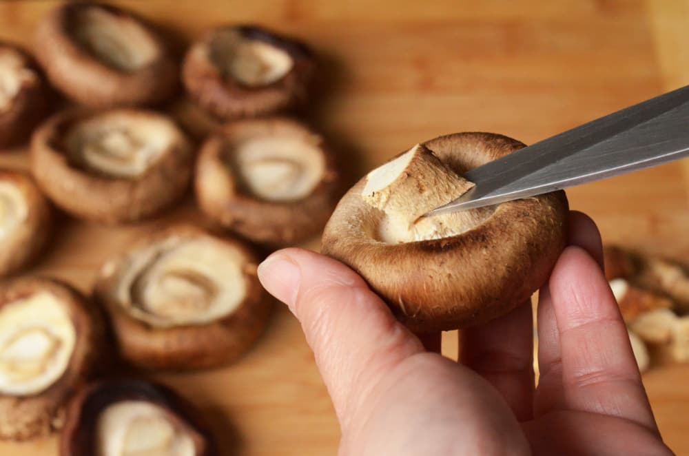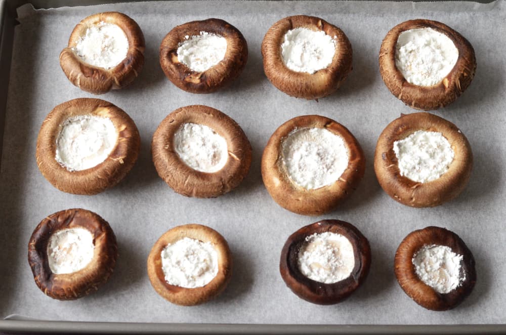 - Lay mushroom caps on a lined tray. Fill the underside of the mushrooms with corn flour.