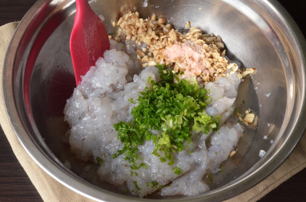 - Mix together pounded shrimps, chopped spring onion, sake and salt until well combined.