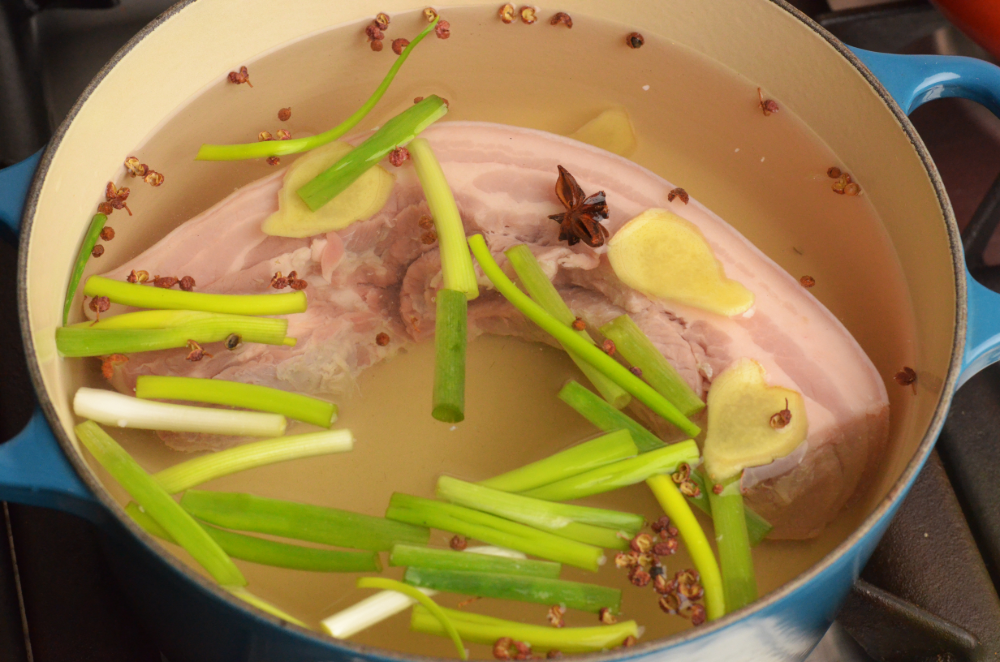 - Fill a medium stock pot with water. Place pork belly and all the aromatics into a pot and bring to a boil. Reduce to low heat and simmer for 1 hour covered.