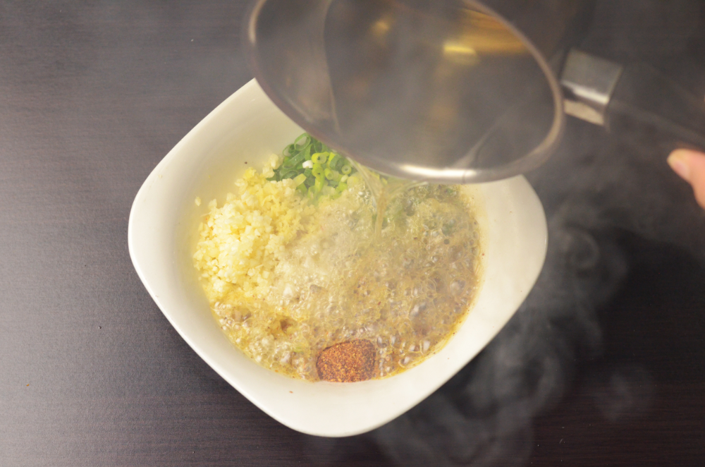 - To prepare the garlic sauce, place all the dry ingredients in a medium bowl. Heat up cooking oil until smoke arises and pour it over the dry ingredients.
