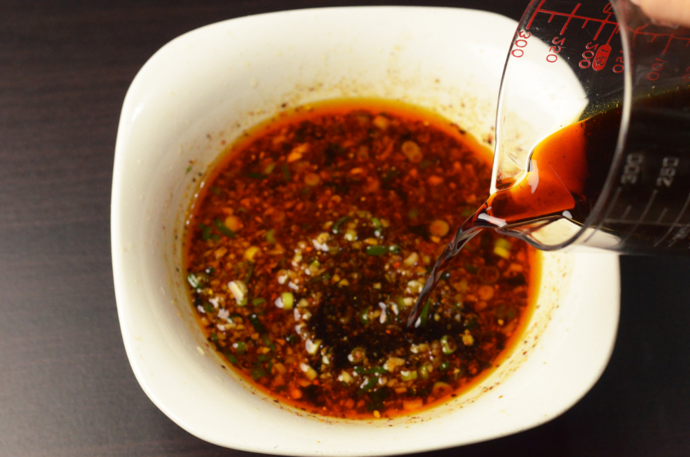 - Mix in light soy sauce, black vinegar and sesame oil.