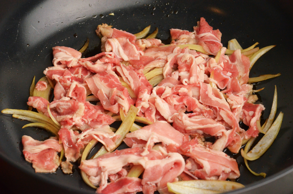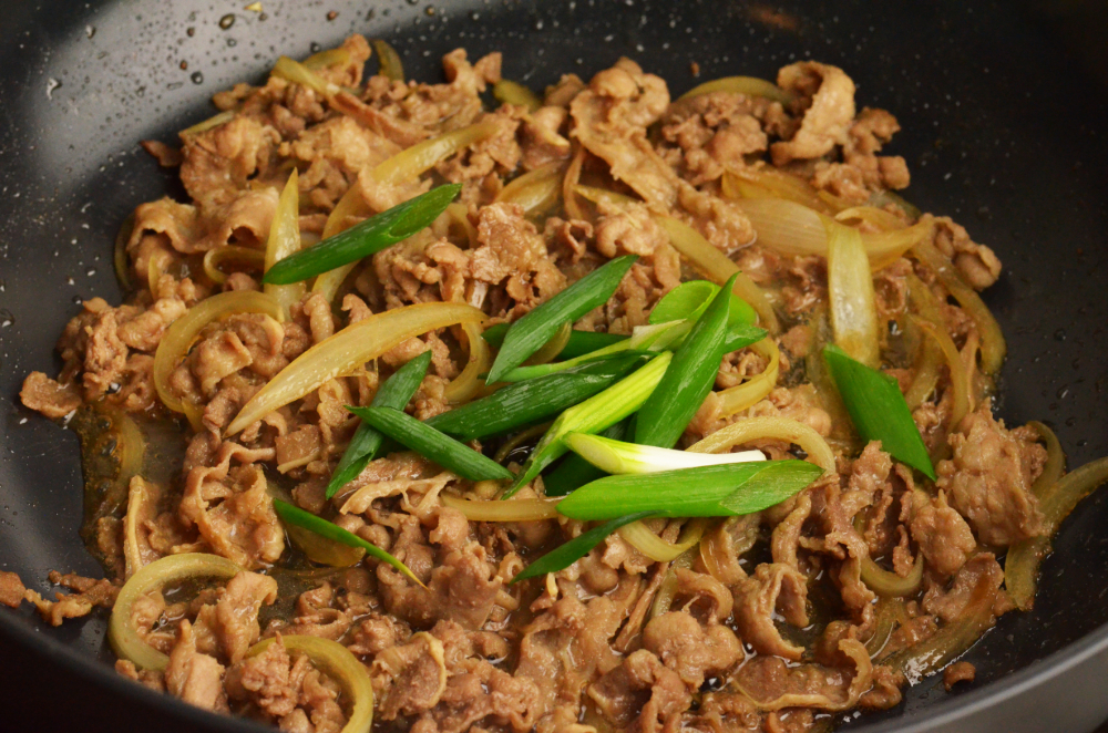 - While rice is cooking, mix dashi, sake, mirin, light soy sauce and sugar together. Pour into the frying pan and arrange sliced onion and beef on top. Heat up over medium heat.