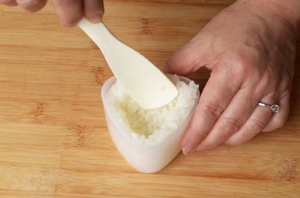 - Use an onigiri mould and fill with a layer of rice, making a small well in the centre.