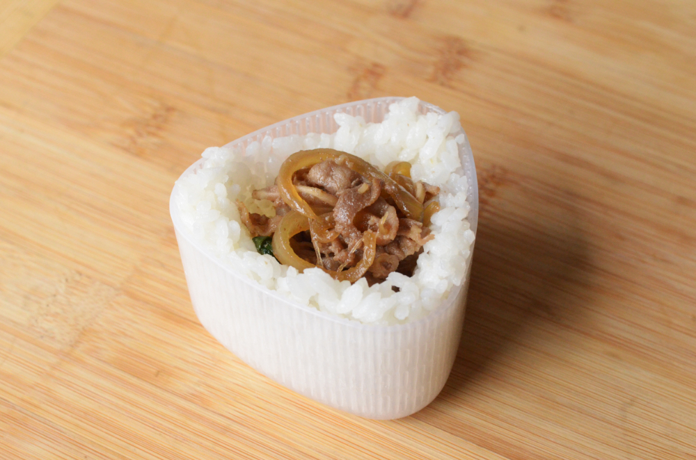 - Fill with beef gyudon then cover with more rice. Press onigiri mould over rice to shape and compact it.