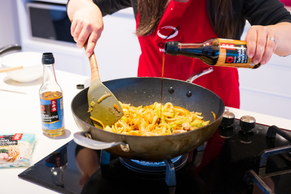 - Add in teriyaki sauce and mirin and continue to stir-fry for 2-3 mins.