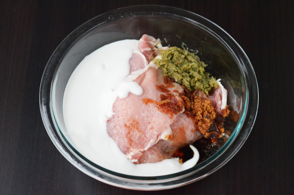 - Add the paste to the pork slices along with the remaining ingredients, mix well to coat evenly. Cover and refrigerate for at least 4 hours or overnight.