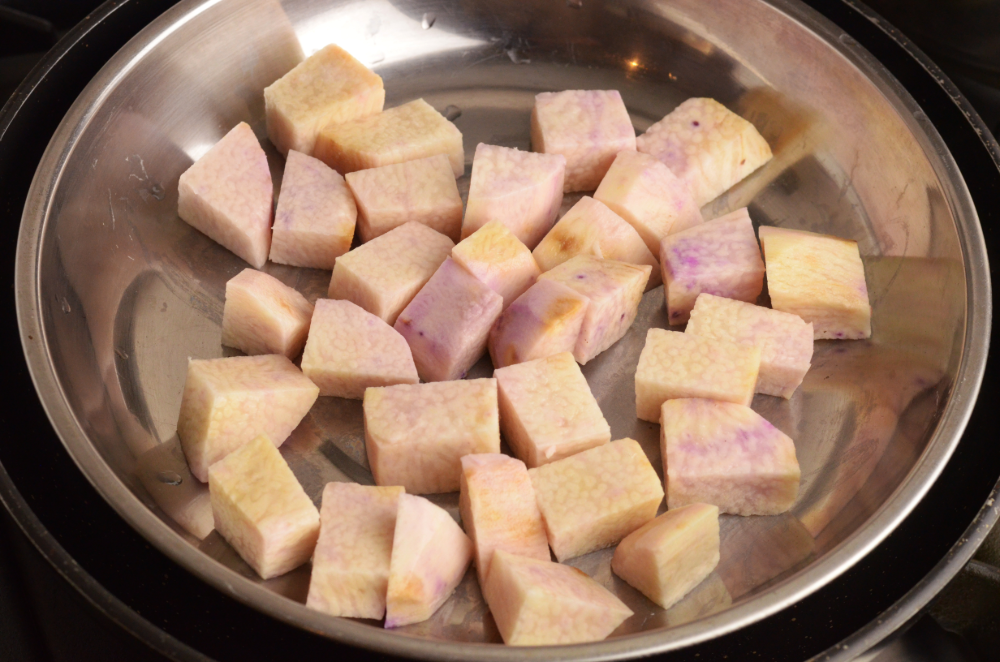 - Steam the cubed ube until soft.