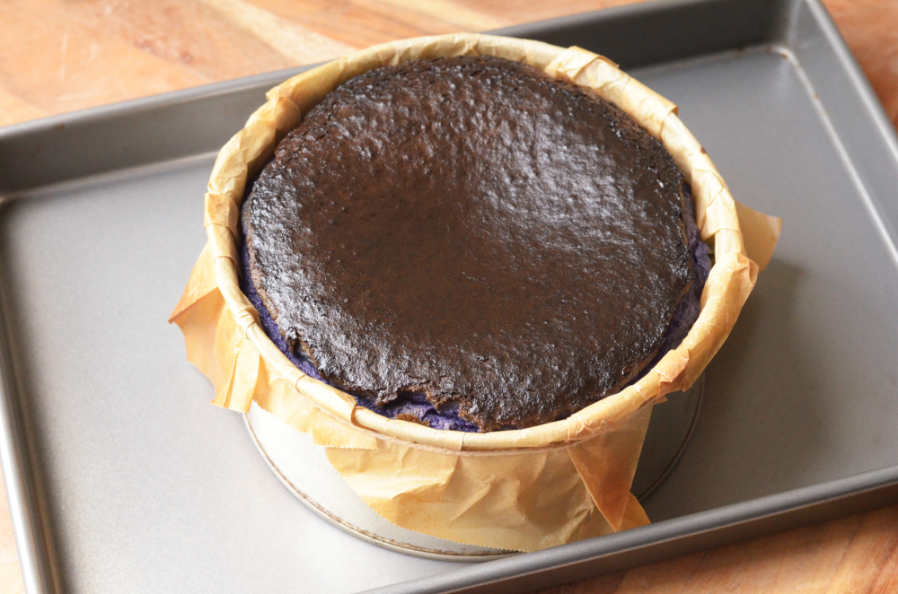 - Pour mixture over a strainer into a lined 6” baking pan and bake for 30 mins on the middle rack. Turn the oven to top heat and bake the surface for 5 minutes.