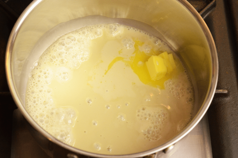 - In a saucepan, heat up evaporated milk, coconut cream and condensed milk. Once it starts to bubble, toss in butter.