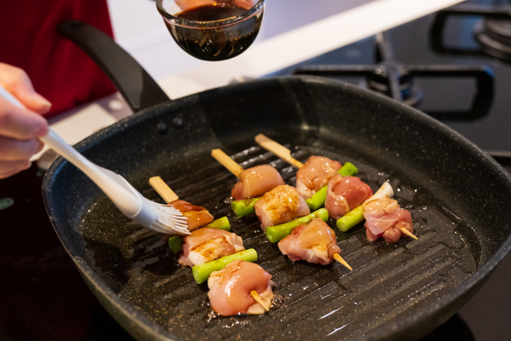 - Place chicken skewers onto wire rack with tray lined with foil. Baste chicken skewers with basting sauce and grill until cook.
